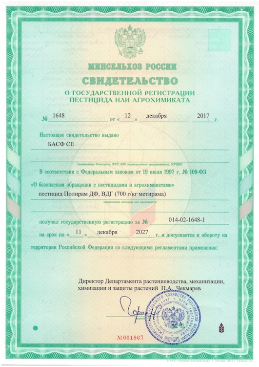 Назначение: Эффективен против фитофтороза, ложной мучнистой росы. Обладает "стоп-эффектом".